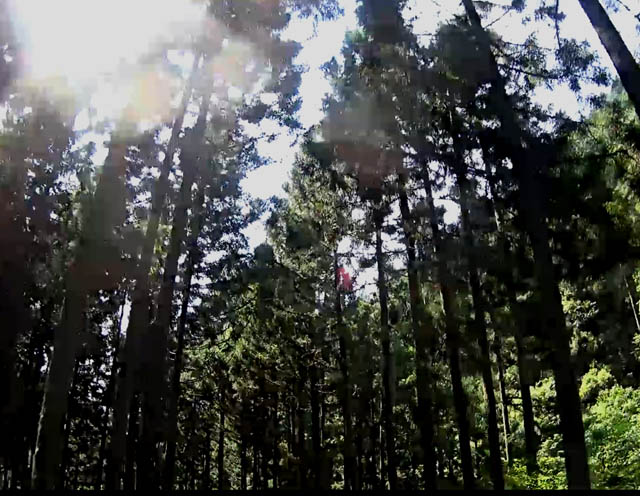 杉の木の上からチラチラと太陽が見えます。見るだけで運が上がりそうな画像です。
