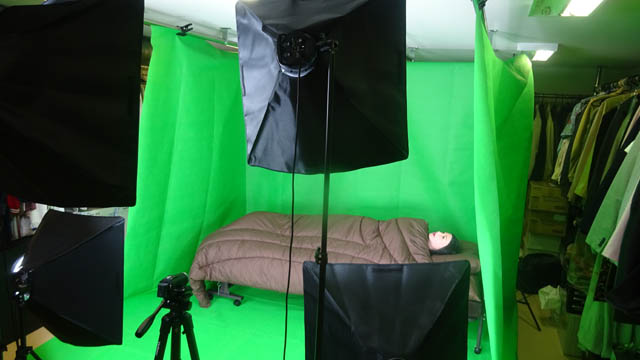 照明が5機セットされてグリーンバックに影がでないようにしています。